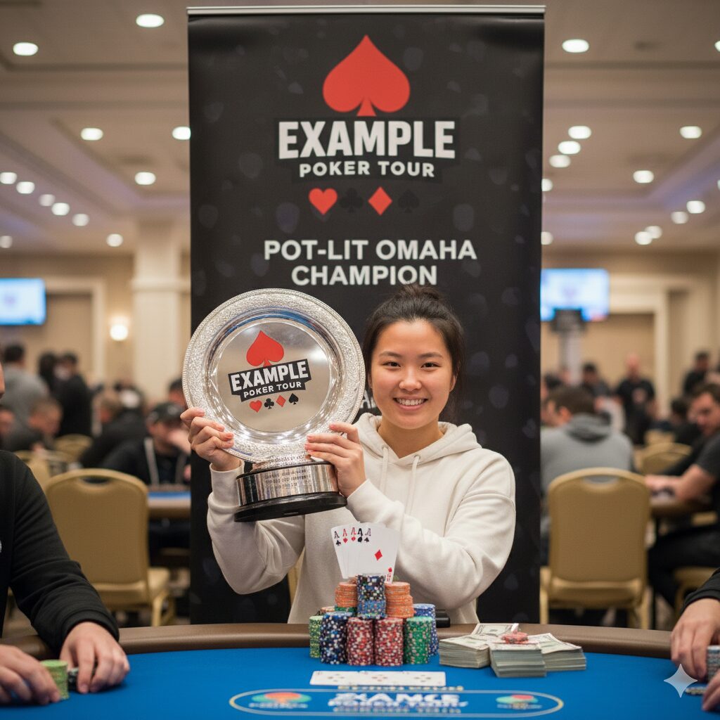 Hannah Chang etched her name into Example Poker Tour history last night with a spectacular comeback victory in the $400 Pot-Limit Omaha event at Silver River Casino. After being down 4-to-1 in chips heads-up, Chang rallied in dramatic fashion to take home the trophy, $12,480 in prize money, and her first ExPT title.