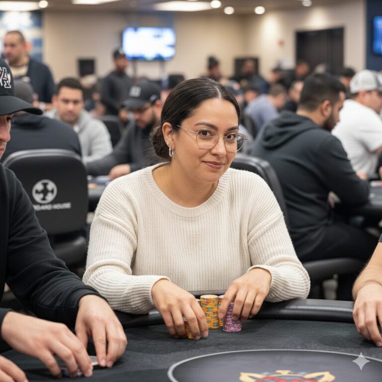 A bilingual Phoenix elementary school counselor, Maria juggles work, family dinners with her parents, and weekend charity 5Ks and poker tournaments. She discovered poker at a home game during the pandemic and dove into training sites, focusing on fundamentals and emotional control. She aims to become the top‑finishing woman on the tour this year. She collects enamel pins from every casino she visits and uses them as lucky card markers.