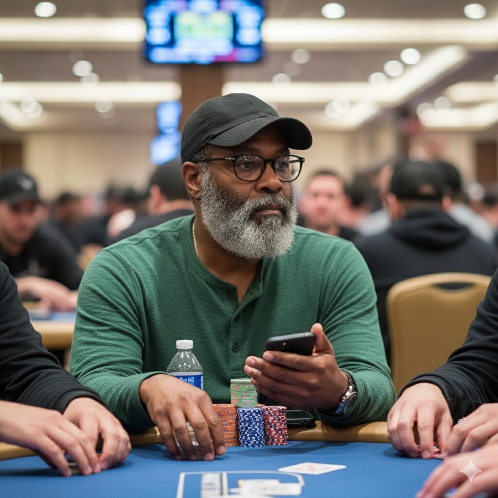 DeShawn “Shawny” Price spends most of his time behind a chair, a barber’s chair, not a chip stack. Even here—midway through Day 2 with 780,000 in front of him—he carries the conversation the way he carries his shop in Madison, Wisconsin: calm, conversational, and neat around the edges. His card cap is a miniature barber pole that he places on his cards the same way he sets a comb on a clean towel—precise, ritualized, ready to work.